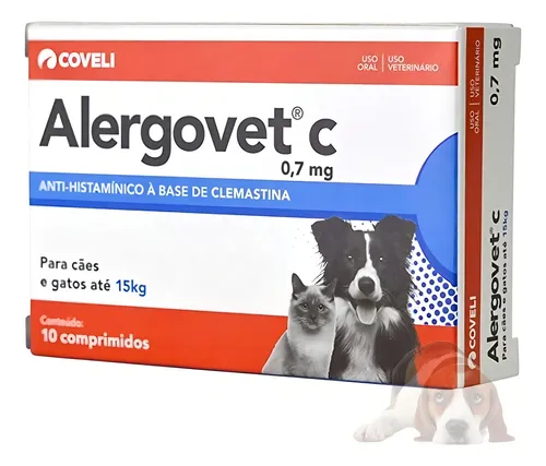 O Alergovet C Coveli 0,7 mg é um antialérgico de administração oral, indicado para cães e gatos que apresentam sinais de reação alérgica, como prurido (coceira), urticária, dermatite alérgica e reações a picadas de insetos. Segundo informação do fabricante, é um produto seguro para uso prolongado e com ação rápida no alívio dos sintomas.