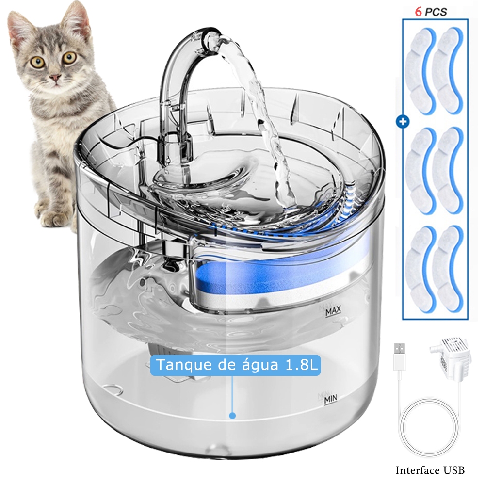 Este é um bebedouro fonte de água automático em plástico PC, com bomba silenciosa, alimentação USB e sistema de filtragem em múltiplas camadas (espuma, resina de troca iônica e carvão ativado). Indicado para: