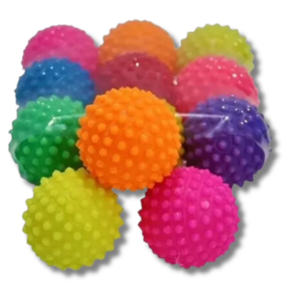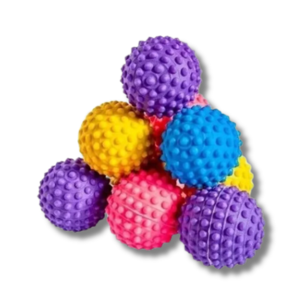 - Textura com cravos que combina estímulo oral e tátil, diferente de bolas lisas.