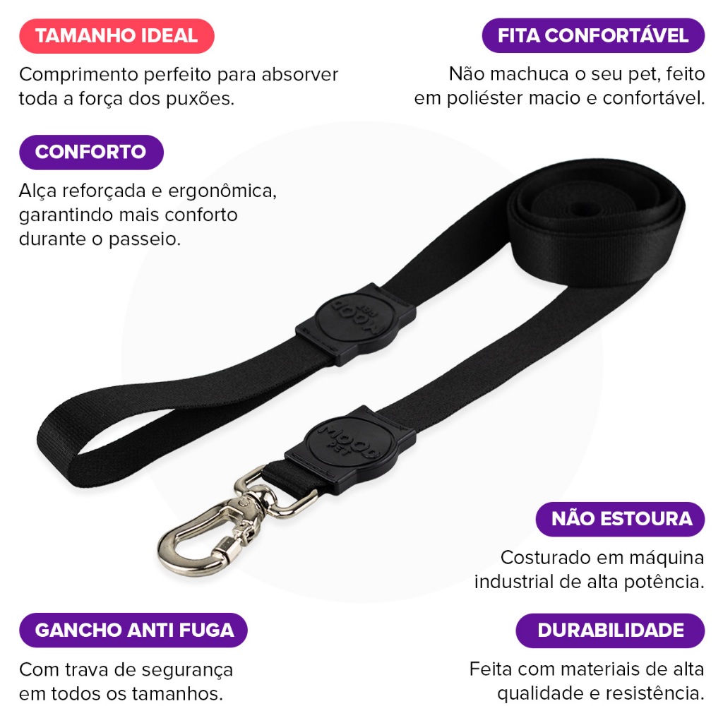 A Coleira Guia Mood Pet é uma guia clássica de 1,30 m indicada para tutores que querem:
