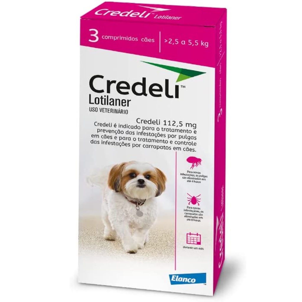 O Credeli 112,5 mg é um comprimido mastigável antiparasitário de uso oral indicado para cães com peso entre 2,5 kg e 5,5 kg. Segundo informação do fabricante, é recomendado para filhotes a partir de 8 semanas e para cães adultos que precisam de proteção mensal contra pulgas e carrapatos (incluindo carrapato-estrela).