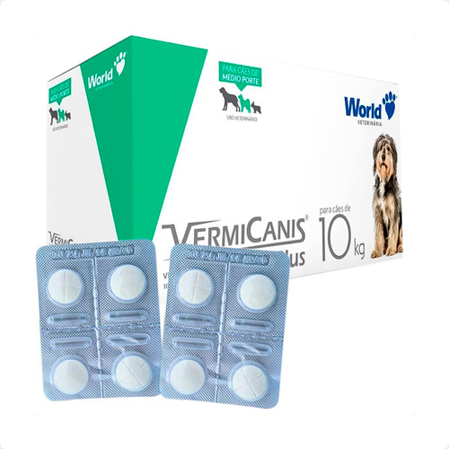 O Vermicanis Plus (World Veterinária) é um vermífugo oral de amplo espectro formulado para cães com aproximadamente 10 kg. Cada blíster com 4 comprimidos contém combinação de praziquantel, pamoato de pirantel e febantel, agindo como ovicida, larvicida e adulticida contra parasitas internos (nematóides e cestódeos).