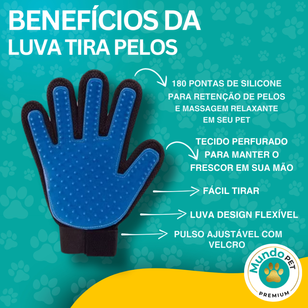 | Luva tira pelos (nano) | Silicone (180 pontas) | Largura ~17 cm / Comprimento ~23 cm | Tamanho único, mão direita |