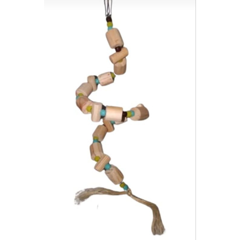O Mobile Espiral é um brinquedo pendente feito com madeira de pinus, miçangas, arame e sisal, projetado para enriquecer o ambiente de calopsitas e outros psitacídeos de pequeno porte. Indicado para tutores que buscam estimular atividade física e comportamento natural de roer e manipular objetos em aves como calopsitas, periquitos, agapornis e similares.