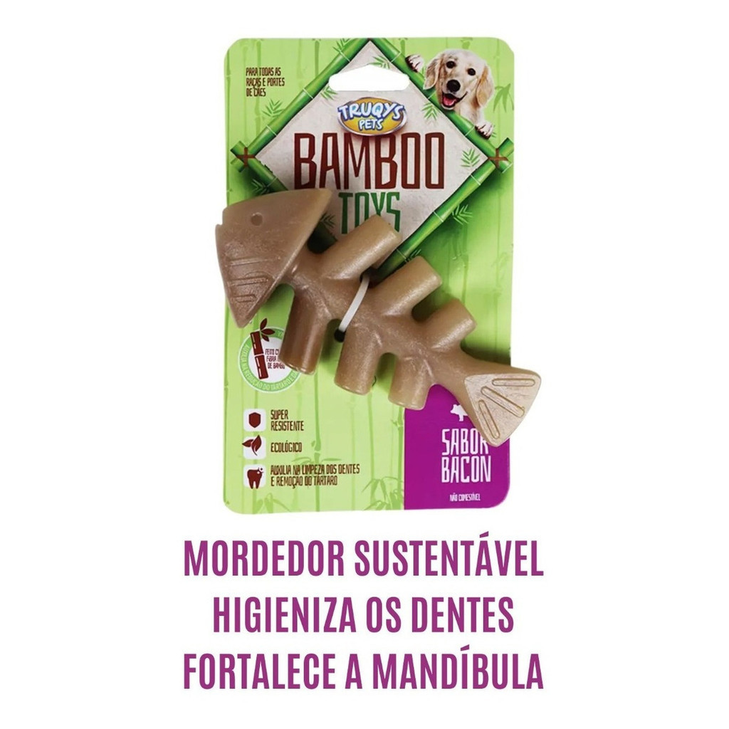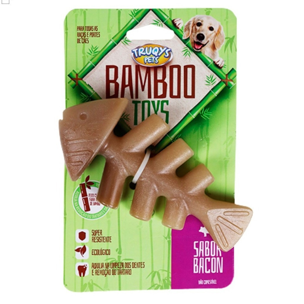 Apresentamos o Mordedor Osso Resistente Maciço Bambu Peixe Aroma Bacon (Truqys Bamboo) — um brinquedo funcional que une higiene dental, resistência e sustentabilidade. Ideal para tutores que buscam reduzir o stress e a destruição de objetos, enquanto cuidam da saúde bucal do cão com um material mais natural.