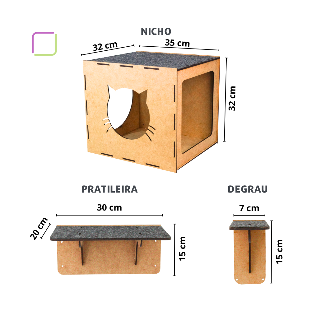 Este é um playground modular para gatos composto por 7 peças em MDF 4 mm com acabamento em carpete na superfície. Indicado para tutores que desejam: