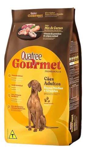 Quatree Gourmet é um alimento Premium Plus desenvolvido com quatro fontes de proteínas de origem animal e ingredientes especiais para aprimorar a nutrição do seu cão. Informação do fabricante descreve a fórmula como superior na palatabilidade e voltada para promover uma vida mais saudável e alegre ao pet.