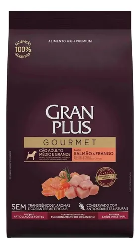 Gran Plus Gourmet Salmão & Frango é uma ração seca completa voltada para cães adultos de porte médio e grande. A fórmula combina fontes animais (salmão e frango) para oferecer perfil proteico variado e ingredientes que favorecem pelagem, saúde digestiva e palatabilidade. O saco de 10,1 kg é pensado para quem busca praticidade no dia a dia.