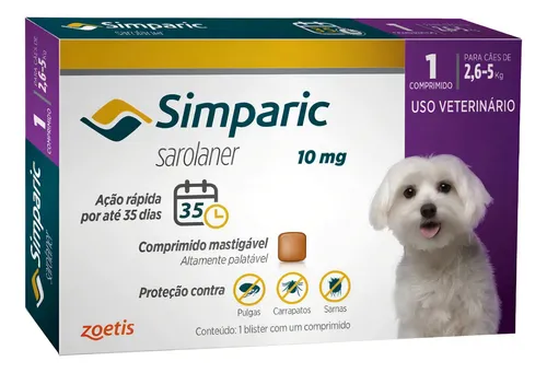 Simparic 10 mg é um comprimido mastigável antiparasitário indicado para cães, com ação contra pulgas e carrapatos. A apresentação anunciada aqui é 01 comprimido avulso (sem caixa) — ideal para tutores que precisam de reposição pontual ou querem experimentar antes de comprar uma embalagem maior.