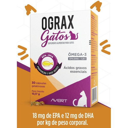Ograx Gatos é um suplemento em cápsulas com ômega‑3 (ácidos graxos essenciais), pensado para administração oral em gatos. Indicado para: