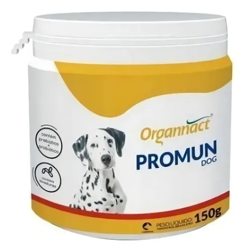 Suplemento Organnact Promun Dog 150g é um suplemento em pó formulado com aminoácidos, vitaminas, probiótico e prebióticos, indicado para cães de qualquer idade e em diferentes fases da vida. Pode ser utilizado como suporte durante doenças virais, períodos de estresse e em vacinações, visando apoio nutricional e da imunidade canina. (Informação do fabricante: consulte o rótulo para composição detalhada e posologia.)