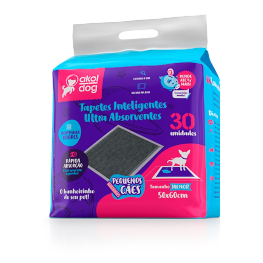 O tapete higiênico Akol Dog Carvão é um tapete descartável de uso sanitário com carvão de bambu na camada de neutralização de odores. Cada embalagem contém 30 unidades no tamanho 50 x 60 cm.