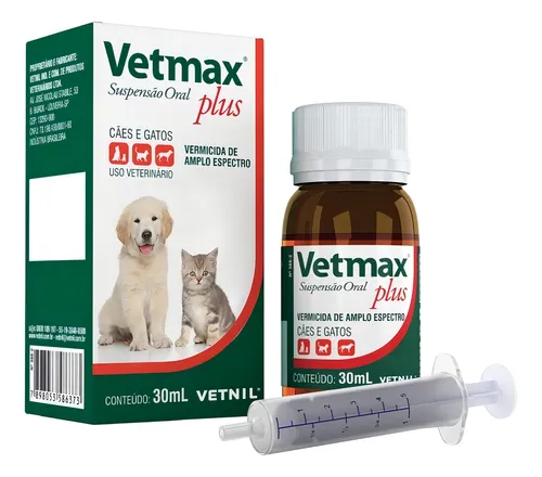 Vetmax Plus Suspensão Oral é um vermífugo de amplo espectro indicado para cães e gatos filhotes. Informação do fabricante: indicado no combate a infecções por nematelmintos (vermes redondos) e platelmintos (vermes chatos), com atuação contra grupos como Ancylostoma e outros parasitas intestinais.